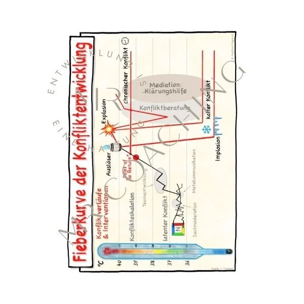 Die Fieberkurve der Konfliktentwicklung von Christoph Thomann (Erfinder der Klärungshilfe) beschreibt, wie das Konfliktgeschehen durch Störungen auf der Beziehungsebene immer “heißer” wird. Latente Konflikte lassen die Temperaturkurve immer weiter ansteigen bis der Konflikt schließlich explodiert, implodiert oder chronisch wird. An verschiedenen Stellen sind interne oder externe Interventionen angebracht, die frühzeitig zur Konfliktklärung beitragen können.